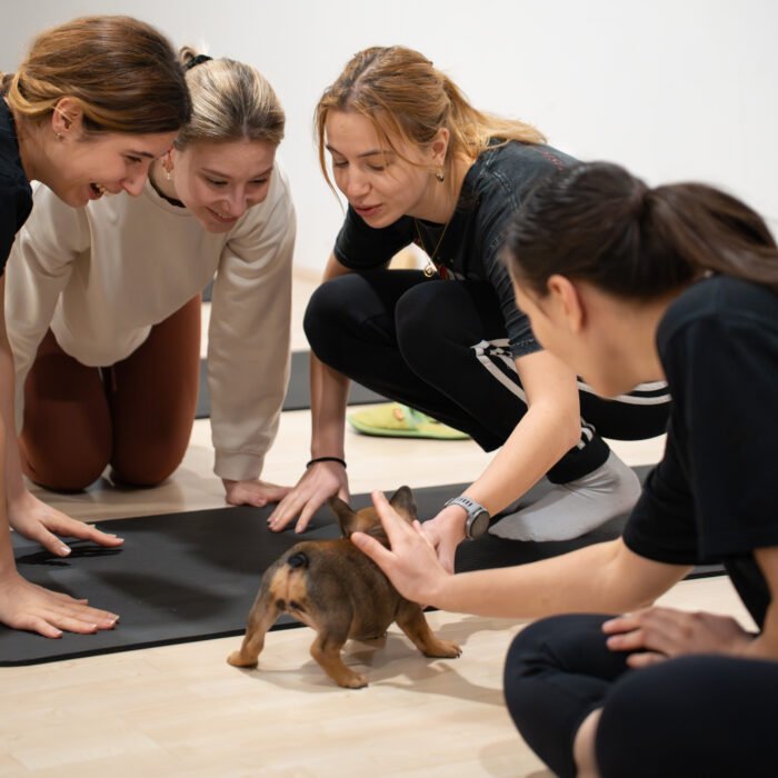 Gre za pilates vadbo v družbi pasjih mladičkov.
